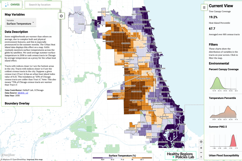 A handful of key metrics―tree cover, air pollution estimates, heat island effects, traffic volumes, and social vulnerability index― help to reveal where in the city people face particular challenges. Following years of collaboration with different groups, we’re now fine-tuning ChiVes to support community efforts.