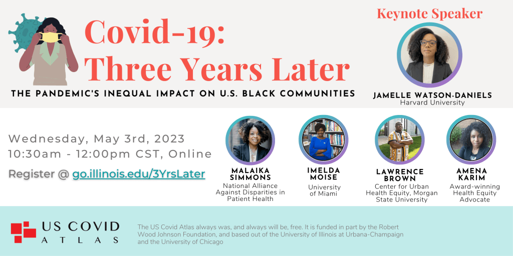 Join us to discuss and call for data needs & action related to Covid-19 in Black Communities, learn about emerging research on the social determinants of health & the pandemic, & get access to toolkits & resources to support advocacy efforts and grant applications. Register for the workshop at: go.illinois.edu/3YrsLater