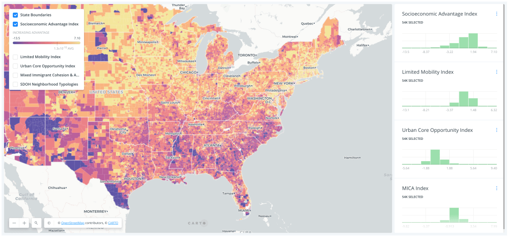 Social Determinants of Health (SDOH) are the conditions in the places where people live, learn, work, and play that affect a wide range of health risks and outcomes. While researchers have long known that socieconomic indicators like poverty and education impact health, it’s less clear why it matters in some places more than others. Our study looked at all the populated census tracts on the United States mainland to look for patterns across fifteen common SDOH indicators. We grouped these as four dimensions of SDOH, and then summarized all tracts as neighborhood types.